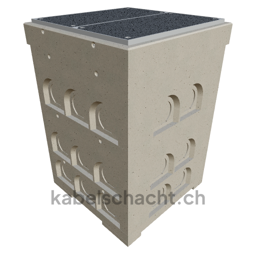 Modular cable duct, internal dimensions 100 x 100 cm, depth 169 cm, TrapeX cover, internal width 100 cm and internal length 100 cm, load class B125 with 2 chrome steel covers and 4 lifting openings, incl. 1 removable chrome steel crossbar, concreted up to 3 cm above ground level.