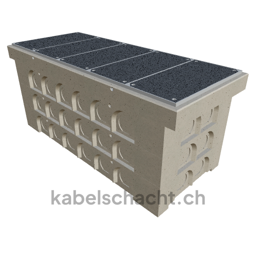 Modular cable duct, clear width 100 x 250 cm, depth 119 cm, TrapeX cover, covering version, clear width 100 cm and clear length 250 cm, load class B125 with 5 chrome steel covers and 4 lifting openings, incl. 4 removable chrome steel crossbars, concreted up to 3 cm OK.