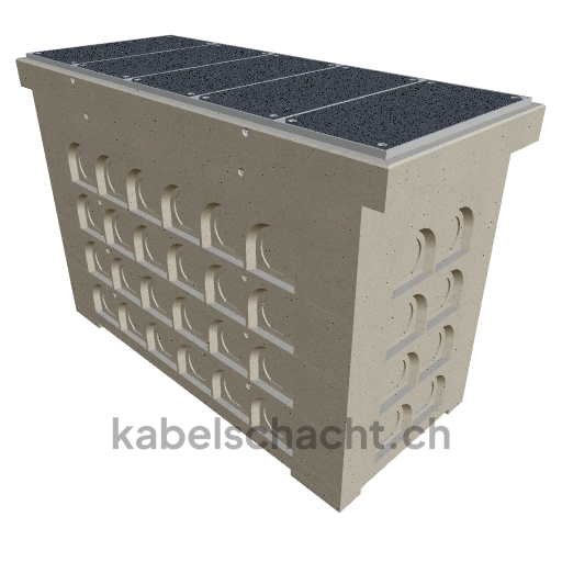 Modular cable duct, clear width 100 x 250 cm, depth 183 cm, TrapeX cover, covering version, clear width 100 cm and clear length 250 cm, load class B125 with 5 chrome steel covers and 4 lifting openings, incl. 4 removable chrome steel crossbars, concreted up to 3 cm OK.