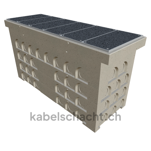 Modular cable duct, clear width 100 x 300 cm, depth 173 cm, TrapeX cover, covering version, clear width 100 cm and clear length 300 cm, load class B125 with 6 chrome steel covers and 4 lifting openings, incl. 5 removable chrome steel crossbars, concreted up to 3 cm.
