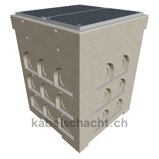 Gaine technique modulaire Dimensions intérieures 100 x 100 cm Profondeur 149 cm Couvercle TrapeX Largeur intérieure 100 et longueur intérieure 100 cm, classe de charge B125 avec 2 couvercles en acier chromé et 4 ouvertures de levage, y compris 1 traverse amovible en acier chromé, bétonnée jusqu'à 3 cm OK