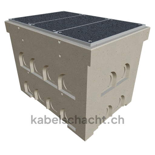 Gaine technique modulaire Dimensions intérieures 100 x 150 cm Profondeur 125 cm Couvercle TrapeX Version avec revêtement Largeur intérieure 100 et longueur intérieure 150 cm, classe de charge B125 avec 3 couvercles en acier chromé et 4 ouvertures de levage, y compris 2 traverses amovibles en acier chromé, bétonné jusqu'à 3 cm OK