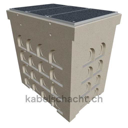 Gaine technique modulaire Dimensions intérieures 100 x 150 cm Profondeur 173 cm Couvercle TrapeX Version avec revêtement Largeur intérieure 100 et longueur intérieure 150 cm, classe de charge B125 avec 3 couvercles en acier chromé et 4 ouvertures de levage, y compris 2 traverses amovibles en acier chromé, bétonné jusqu'à 3 cm OK
