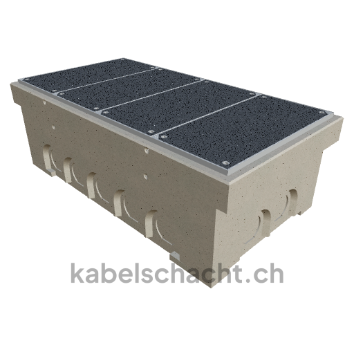 Gaine modulaire Largeur intérieure 100 x 200 cm Profondeur 71 cm Couvercle TrapeX Version revêtement Largeur intérieure 102 et longueur intérieure 200 cm, classe de charge B125 avec 4 couvercles en acier chromé et 4 ouvertures de levage, y compris 3 traverses amovibles en acier chromé, jusqu'à 3 cm OB bétonné
