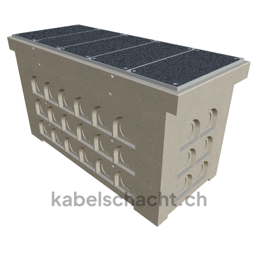 Gaine technique modulaire Dimensions intérieures 100 x 250 cm Profondeur 149 cm Couvercle TrapeX Version avec revêtement Largeur intérieure 100 et longueur intérieure 250 cm, classe de charge B125 avec 5 couvercles en acier chromé et 4 ouvertures de levage, y compris 4 traverses amovibles en acier chromé, bétonné jusqu'à 3 cm OK