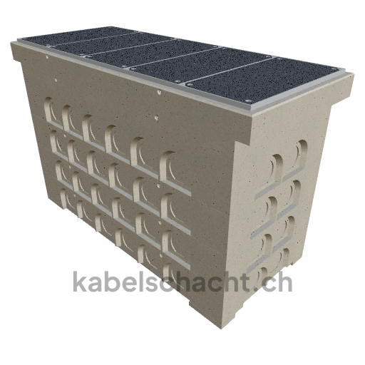 Gaine technique modulaire Dimensions intérieures 100 x 250 cm Profondeur 173 cm Couvercle TrapeX Version avec revêtement Largeur intérieure 100 et longueur intérieure 250 cm, classe de charge B125 avec 5 couvercles en acier chromé et 4 ouvertures de levage, y compris 4 traverses amovibles en acier chromé, bétonné jusqu'à 3 cm OK