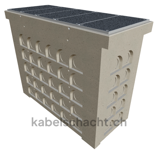 Gaine technique modulaire Dimensions intérieures 100 x 250 cm Profondeur 217 cm Couvercle TrapeX Version avec revêtement Largeur intérieure 100 et longueur intérieure 250 cm, classe de charge B125 avec 5 couvercles en acier chromé et 4 ouvertures de levage, y compris 4 traverses amovibles en acier chromé, bétonné jusqu'à 3 cm OK