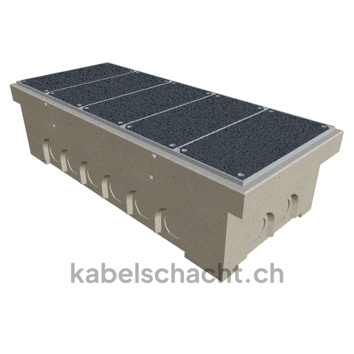 Gaine technique modulaire Dimensions intérieures 100 x 250 cm Profondeur 71 cm Couvercle TrapeX Version avec revêtement Largeur intérieure 100 et longueur intérieure 250 cm, classe de charge B125 avec 5 couvercles en acier chromé et 4 ouvertures de levage, y compris 4 traverses amovibles en acier chromé, bétonné jusqu'à 3 cm OK