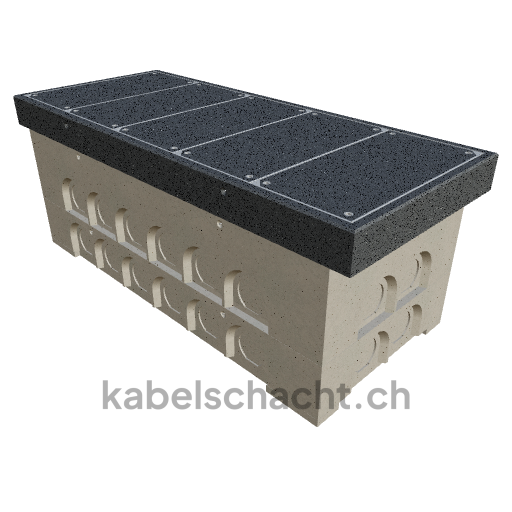 Gaine de câbles modulaire, dimensions intérieures 100 x 250 cm, profondeur 105 cm, couvercle TrapeX, largeur intérieure 102 cm et longueur intérieure 250 cm, classe de charge B125 avec 5 couvercles en acier chromé et 4 ouvertures de levage, y compris 4 traverses amovibles en acier chromé.