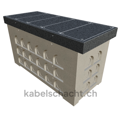 Gaine de câbles modulaire, dimensions intérieures 100 x 250 cm, profondeur 149 cm, couvercle TrapeX, largeur intérieure 102 cm et longueur intérieure 250 cm, classe de charge B125 avec 5 couvercles en acier chromé et 4 ouvertures de levage, y compris 4 traverses amovibles en acier chromé.